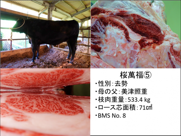 「桜花久」と同様に本牛の全きょうだい牛(去勢)枝肉成績が判明しており、A5-11、503.9kg、ロース芯面積88㎠と良好な成績でした。