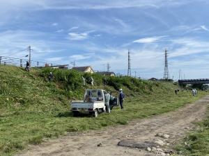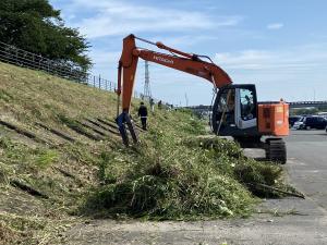 日頃から利用者の多い駅館川左岸河川敷の草刈り、ゴミ拾い、支障木伐採を行いました。暑い中での活動でしたが、今年も大分県建設業協会宇佐支部に重機やトラック等を提供していただき、効率よく作業を行うことができました。