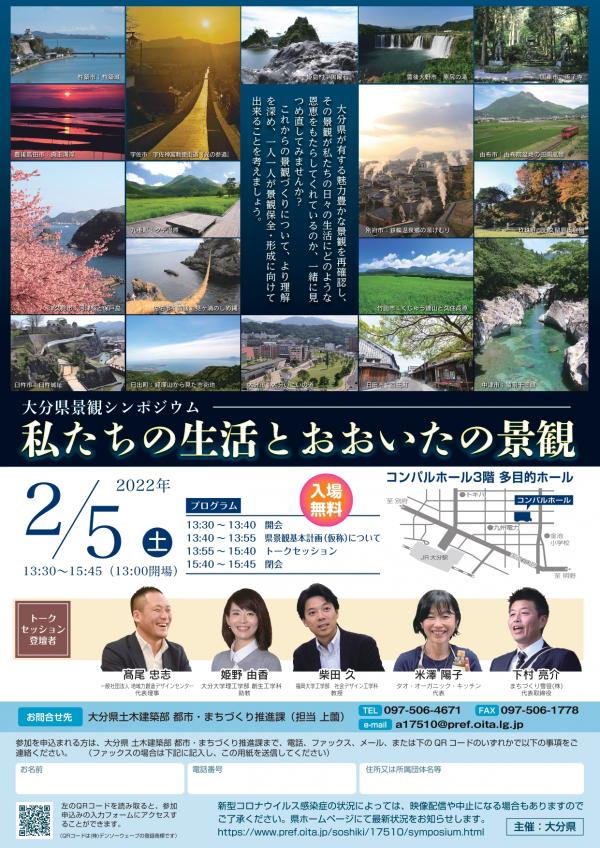 令和4年2月5日(土)に大分市コンパルホールで開催を予定していた大分県景観シンポジウムについては、新型コロナウイルス感染症拡大の状況を受け、会場での開催は中止とし、録画による動画配信に変更しました。